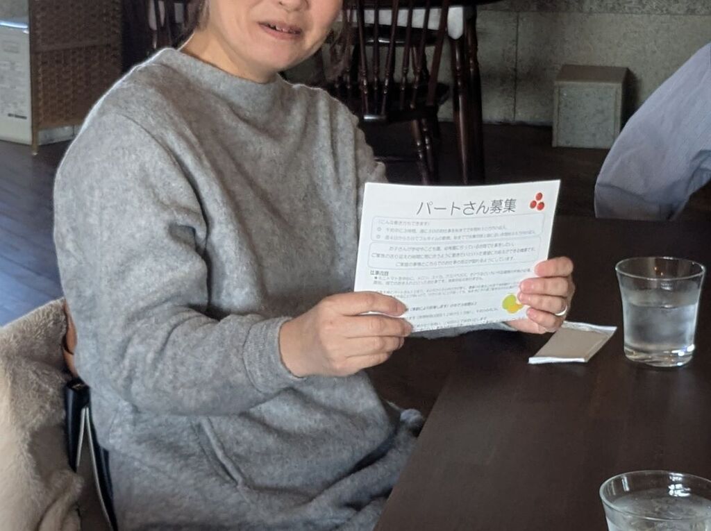 Yさん(昨年より勤務。今年が2年目): そうなんです。岩見沢で配られていた、Mさんが載っていたチラシ。私は本当に、あの内容が「ドンピシャ」だったんです。でも、20数年ぶりに履歴書を書くとなると、不安で。チラシを見ながら「これ、本当に嘘じゃないよね? 私でも大丈夫かな」って、何度も読み返したのを覚えています。